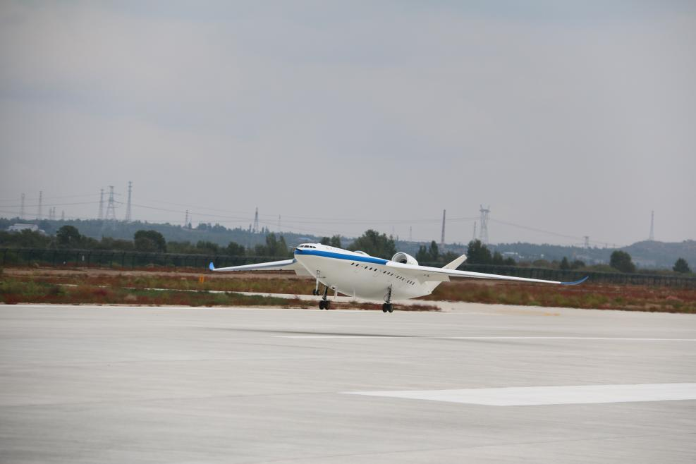 学校研制的翼身融合大型客机的缩比试验机在我校靖边通用机场试飞成功
